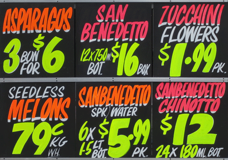 When I was 15 I got a job at the newly opened local Woolworths. Out the back, right next to the tea room, was a place that held enormous allure – the showcard and ticketwriting room. I started as a price chaser and made my way up the ranks to checkout chick, but neither job held the mystery and fascination of ticketwriting. I wondered if I could learn that secret writing style, but I never did. These days you don’t see it around so much, but one of my local grocers displays this fine example. It reminds me of a time, and I am pleased it is a skill that has not disappeared completely.