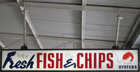 I like everything about this fish and chips: the red no-mucking-around sans serif and the chunky blue script leave no doubt as to what this vendor has to offer. And I particularly like the ampersand. Then there is the bonus embellishment of fishy line drawings and an orange crustacean that definitely isn’t an oyster. I also like how the sign itself hangs from big hooks, a catch of the day in its own right. Word has it that the takeaway here is pretty good, so I’d better get down there again and find out.