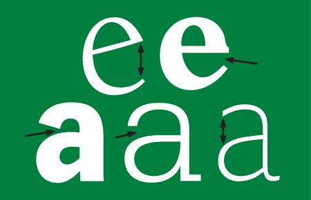 The word aperture comes from the Latin apertura, meaning opening, so it follows that, in typography, aperture would refer to an opening in a letter from. Specifically, it is the opening to the partially enclosed negative space (or counter) in characters such as a, c, e, n and s. Apertures can be small or large depending on the typeface. The lower case e of Berkeley Oldstyle Book has a large aperture due to the angle of the horizontal bar, but the e of Bembo Bold has a relatively small aperture. Vectora’s a has a tiny aperture, and while Serifa Light’s is larger, it is still small compared with that of Today Extra Light.