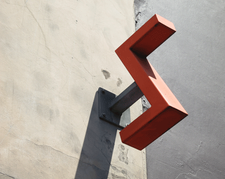 Although this big red Z is building signage it works equally well as urban sculpture. It’s a bold statement, this lightning bolt of red, and the cracks in the backdrop of plasterwork, the steely grey abutting the dirty, gritty off-white, and the hard shadow make the gutsy red metal shape even more dramatic.