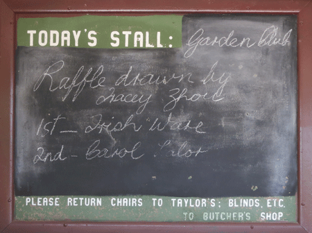 Here’s a work of art and it comes ready framed! A rich story could be constructed from the elements presented here: a garden club, a raffle, a butcher’s shop, what did Trish and Carol win, and why are the chairs being returned to Taylor’s? The chalk-drawn handwriting displays the running writing style that was taught in Australian schools in a certain era, and the background patina of many-times-rubbed-out chalk holds the social history of a community.