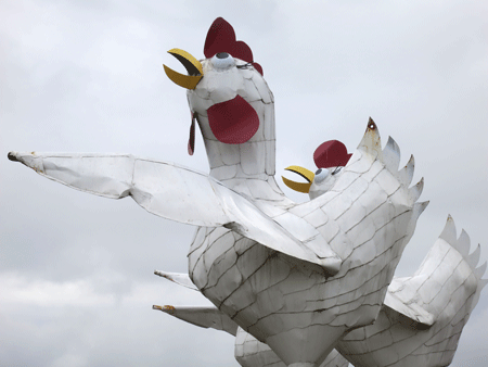 These magnificent birds loom large on the roadside about half way between Geelong and Ballarat, overseeing the entrance to a free-range egg farm. The egg farm prides itself on its humane practices and healthy birds, and if the chooks are anywhere near as jolly as their giant metal guardians appear to be, then they are happy chooks indeed. The surrounding landscape is scrubby and flat, which makes the metal sculptures—there are three of them—an even more arresting sight to behold.