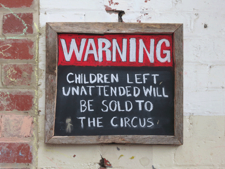 This is not the sort of warning you see every day. The novelty of the message caught my attention and tickled my funny bone, but the same words printed more formally in, say, Franklin Gothic or Times New Roman, would change the tone completely. Handwritten in chalk, framed with uneven knocked together old timber, and the serious message that parents need to watch their kids in the play area is delivered in exceedingly good spirit. The message is not the full picture though: the choice of blackboard and frame is obviously well thought out to fit in with a design aesthetic, as is the placement on the background of scarred and scrawled-on brickwork which has been left in its original state.