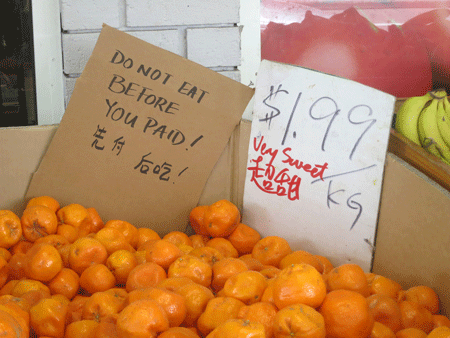 The first thing I noticed about this texta-on-cardboard writing was not its grammar, or even its message, but how neat the writing was. There tends to be two types of greengrocer writing in my neck of the woods: the stylised signwriting style; and the messy uneven scrawl of the handwritten notice, where the length of the words have not been considered when pen is first put to paper, so the first letters are large and confident and as it becomes clear that the paper is going to run out before the message is fully written, it becomes increasingly squished to fit. This one stands out for its all-round penmanship—in two languages, no less!—as well as its message.