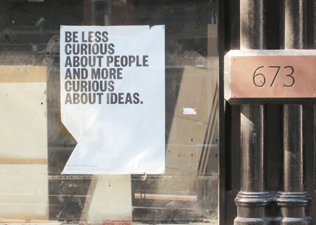 It’s not so much the quote, but the juxtaposition of textures and the harmony of colour and tone. I like how the tears in the paper of the poster look like intentionally designed black triangles, and how the light through the dirty pane of glass illuminates the shapes inside. The whole reminds me of one of those fabulous Rauschenberg ‘combines’, the ones where he silkscreens on to sheer fabric which is floated in front of the collage. The typeface looks like a version of Helvetica Heavy Condensed with a little judicious kerning and condensing to improve the fall of the lines.