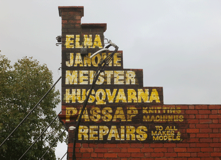 Here is an excellent example of using an available setting to advantage! The stepped side of this building could have been made-to-measure for this sewing machine shop and haberdashery: either that or the sewing machine brands custom-named to fit so conveniently. I like the way this block of type has been designed to work in the space, and although it is fading and far from recently painted, it is still striking and legible.