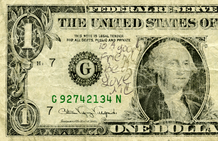United States banknotes are so different to Australian ones! Ours are plastic and brightly coloured—pink, blue, red, yellow and green—and the smallest denomination is $5. You end up with a load of shrapnel in your purse, and think you don’t have any cash because you don’t have any notes left. But all the $1 and $2 coins can add up! In the US, I find the opposite is true. I end up with a wad of banknotes that make me think I’ve got enough ready cash, only to find that every one of them is a single, I’ve got less that 10 bucks on me, and I have to resort to the credit card. The US Federal Reserve estimates that the average lifespan of a dollar bill is 5.9 years. I would say that this one is near the end of its life. It’s creased and worn and thin, and has extra character because it comes complete with its own handwritten message from Nic to Beth.