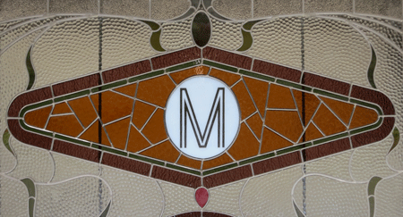 I know almost nothing about stained glass, whether it be coloured glass as a material, or the art and craft created from it. Working with glass seems to me inordinately difficult, and although I once learnt how to make glass beads, I am much more at home with a sharp blade, a bonefolder and a few sheets of paper. Somewhere in the back of my mind, in that receptacle that stores trivia, is a snippet of information about beer bottles: that brown glass protects beer from going off by filtering light absorption, but green glass is fine for beer with a lower hops content. None of which has much to do with this stained glass window, which caught my eye for the mix of design styles and glass textures, not least the M on an opaque white oval.