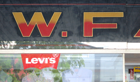 In proofreading, w.f. stands for ‘wrong font’, but that can hardly be applied here, even though my pavlovian response is to look for where to make the correction! Every country town most certainly has its butcher, baker and candlestick maker, but the kind of store I gravitate towards is the double-fronted outfitters—women’s clothes on one side, men’s on the other, recessed doorway in the middle allowing maximum window shopping. This clothing store was even wider, with four windows and two doors, and the vignetted, gold-outlined signage appeared twice. The letter shapes were almost the same but not quite, and I particularly liked this F, which was much more elongated than its counterpart above the other doorway.
