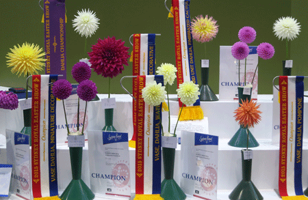It’s Sydney Royal Easter Show time again. This year I am very pleased to be the recipient of a blue ribbon for my cased-in binding. I left the making of the book till the last minute—the glue was barely dry when I delivered it to the arts and crafts hall—so the photograph will have to wait till later. Meanwhile, after my stint on the NSW Guild of Craft Bookbinders demonstration table yesterday, I spent the afternoon enjoying the rest of the show. I watched dogs rounding up sheep and horses rounding up cattle, admired fruit cakes and sultana cakes and pumpkin scones and jars of lemon butter and marmalade. And this colourful display of dahlias with their ribbons, certificates and handwritten labels.