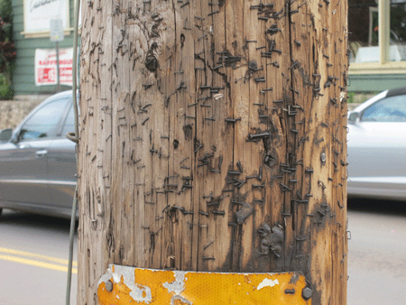 This may well be just a telegraph pole cluttered with old staples and nails, but what a work of art! This accidental sculpture in upcountry Maui—the splintery wood, those rusty staples and bent nails, and the yellow reflector that has seen better days—would, I’m sure, have a story to tell in the notices, no longer attached, of community meetings, lost dogs, items for sale, local events and who’s been playing at the bar up the road.