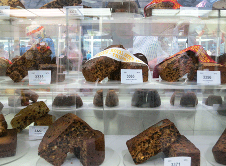 The easter show would not be the easter show without cake. The arts and crafts pavilion features row upon row upon row of sultana cake, marble cake and various classes of fruit cake, all baked to exact—and exacting—standards. No use of ring tins, no rack marks, no packet mixtures, no icing. In fruit cakes, nuts must be cut to a size that doesn’t interfere with the cutting of the cake. Cakes can be round or square, but must be 20 cm. No trimming, smooth sides, evenly browned, fruit distributed evenly, moist but not heavy or doughy. More rules than you can poke a stick at! What intrigues me is the judging. Each of these cakes has a small wedge cut out of it for tasting—but after a few mouthfuls, how is a judge able to distinguish one bite of cake from another, especially when they are made using the same recipe!