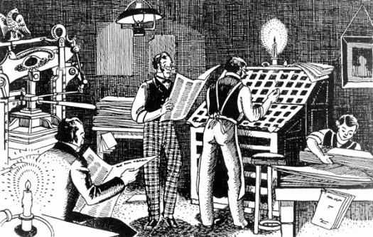 I have some pre-digital Sydney Morning Herald lead type. I’m not exactly sure what I’m going to do with it, as I don’t have a printing press or even a type cabinet, so I suspect that a good proportion of it will go the way of most of the other Herald lead and get melted down. Once I can bear to part with it, that is. My dilemma is that it is body text, maybe 7pt or 8pt, so it’s fiddly to handle, not that you want to be handling it too much and breathing in the dust, and anyway, for my creative purposes I don’t need a lot, just a few pieces of each letter. The type came accompanied by this picture, which I can only assume is an illustrated snapshot of the Herald back in the day. I particularly like the press on the left, which looks very much like a Columbian Press. The Columbian Press, manufactured in Philadelphia in 1813, was the first press to be operated efficiently by levers, and was designed to allow a whole newspaper page to be printed in a single pull. The counterweight, in the form of a neoclassical eagle, sits balanced on the counterpoise lever. The scene depicted here looks rather relaxed, but perhaps it is a slow news day and they are nutting out the cryptic crossword.