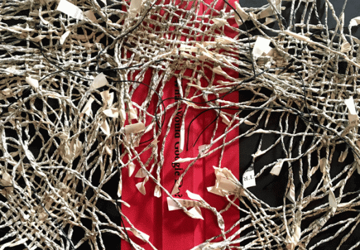 There’s a lot going on in my studio. I am working away at my book—my book to be published, that is, not my artists’ book (it gets confusing!)—and at the same time I’m preparing for three exhibitions. Today I’m focussing on the first of those exhibitions: a show called Re:Play, featuring new work from my book group, Sydney Book Art Group. This is a detail from a piece I have just finished. I used a discarded cover from a book called What Would Google Do? and made paper string from Encyclopedia Britannica pages. The string is woven and then sewn onto the cover. It’s fiddly and challenging making all that paper string, but I’ll be making more of it today for my next piece!
