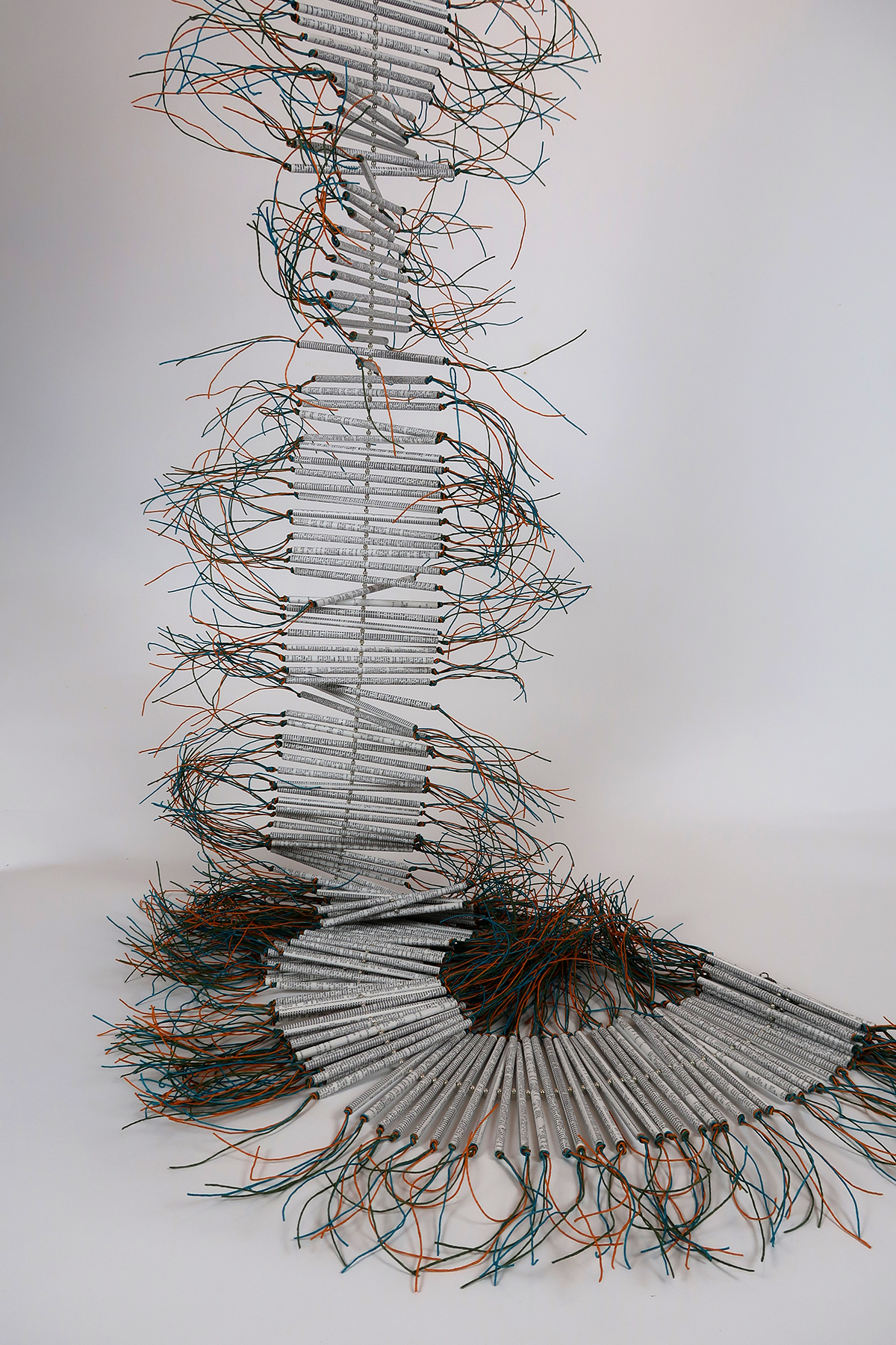 I rolled and threaded the pages to create a scroll. When fully rolled it promises to have something to reveal, the index pages presenting a code that needs to be cracked to discover meaning within. It can be partly rolled open, partly extended flat. Or hung on a wall. Or be fully open and suspended, needing only the slightest of air currents to make it revolve on its axis. Free of constraint and revolving, it evokes lightness and joy. And it looks like a giant firework, a ‘cracker’ that sparks memories of childhood celebration, happiness and play.