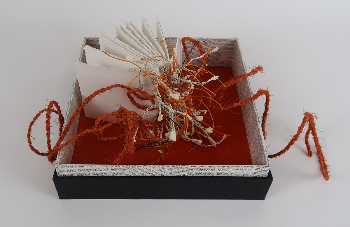When I was given my book title to work with I was greatly amused by its synchronicity: orange is my favourite colour. Initially I planned to make a work based solely on the colour itself. However, my book art object took on a life of its own, and the more time I spent making it the more it insisted on becoming a reflection of Iwaki Kei’s story. My use of dictionary and encyclopedia paper represents the characters’ navigation of new language and culture, just as the mess of spine binding material on one side – difficulty and challenge – is countered by clean, open, white pages, allowing a new life of optimism to be written.