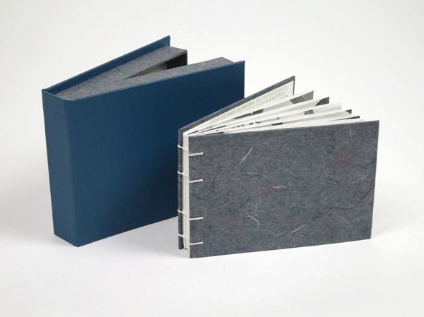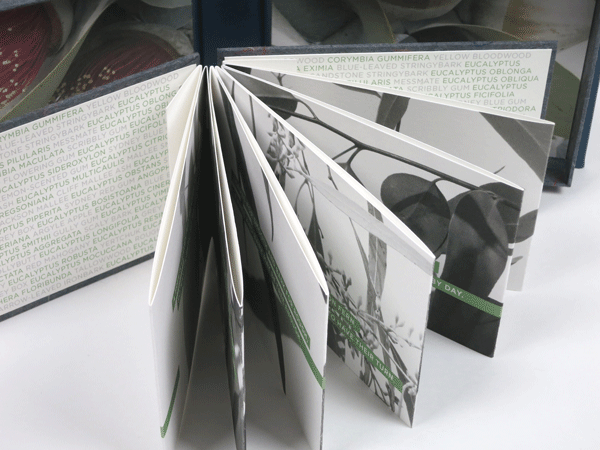This book is a homage to the eucalyptus trees that are native to the area where I live. In my view, the importance of plant life in our present day world cannot be underestimated. Trees are not just aesthetically pleasing: they clean the air we breathe and regulate temperature, and as a result enhance our quality of life. On an emotional level, walking in nature, particularly the Australian bush, provides me with strength and renewal. The universal language of Robert Frost’s poem, which has been used for the text, also resonates with me, giving another level of meaning to the beauty of our natural environment, which only adds to the imperative that we need to preserve it. Structurally, the book fans into a flower shape and is housed in a Solander box — a form named for its inventor, botanist Daniel Solander, who played an important role in the history of Australian plants.