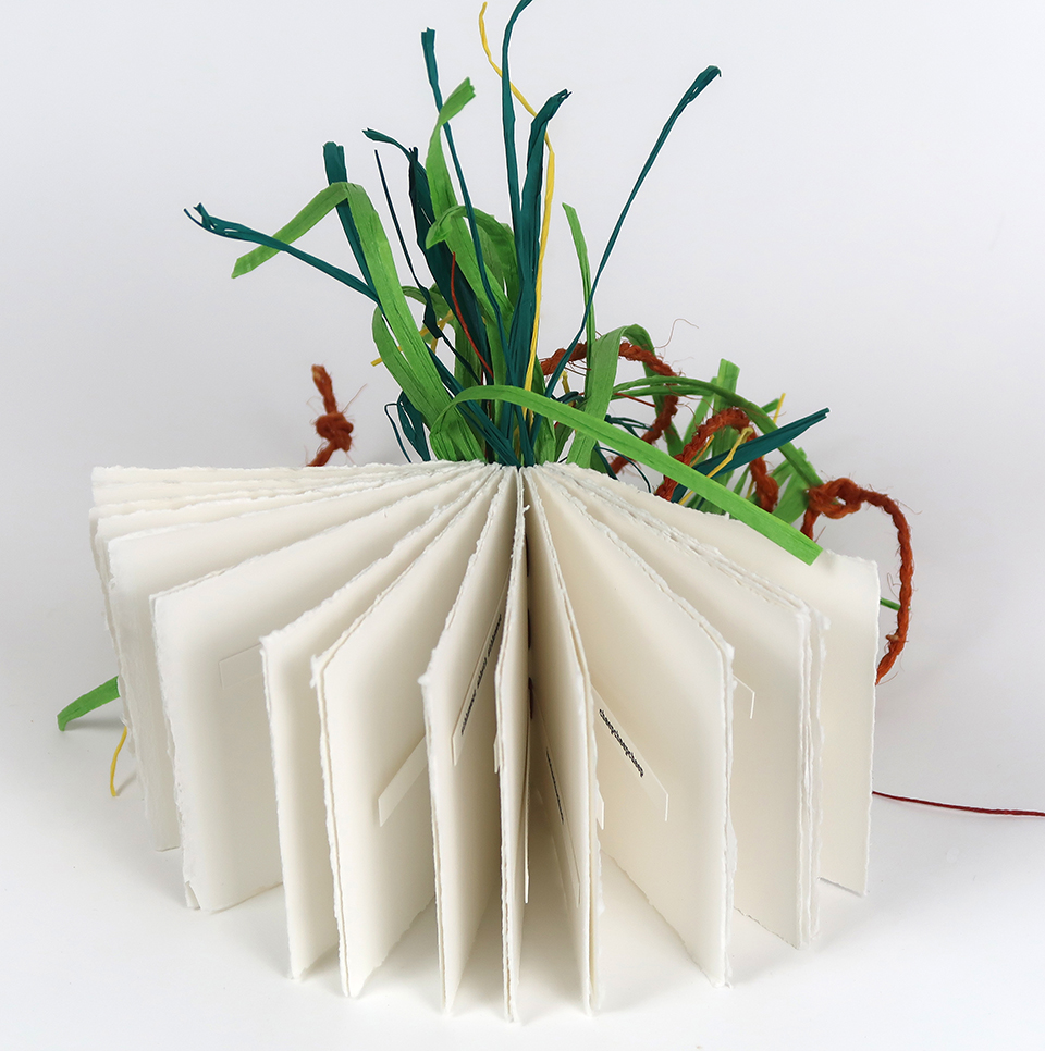 Somerset paper, pigment inks, raffia, paper string, linen thread, coconut fibre