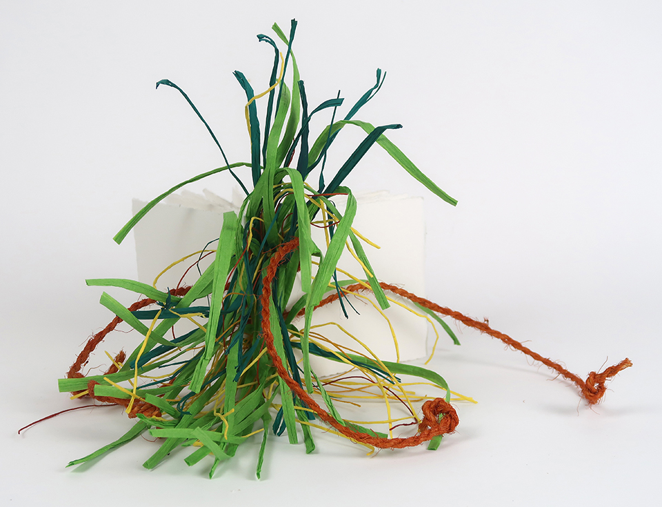 Somerset paper, pigment inks, raffia, paper string, linen thread, coconut fibre