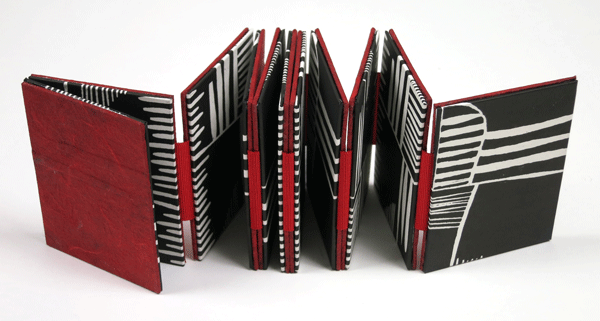 ‘Sheet music’ consists of five verses and six choruses. Six woodblock prints, from an edition I made some time ago, were disassembled and reconfigured into this concertina book where the rhythm of the imagery dictated the structure. A relief pattern, harmony to the chorus, appears on the reverse side. The eleven panels of the concertina can be arranged any number of ways, from tightly zigzagged to fully open, and when handled the pages make a click clack sound.